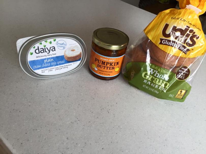 It is that time of year again, everything is PUMPKIN! I love this combination for breakfast, lunch or just a snack. Udi’s bagels are a staple. I love using them for sandwiches and even blitzing to make bread crumbs. I try to keep all three flavors of Daiya cream cheese in the fridge. The strawberry is hard to find so when it does run out I pray that the two places that carry it have it in stock. This is a perfect snack for watching the leaves fall or curling up on the couch on a dreary day.