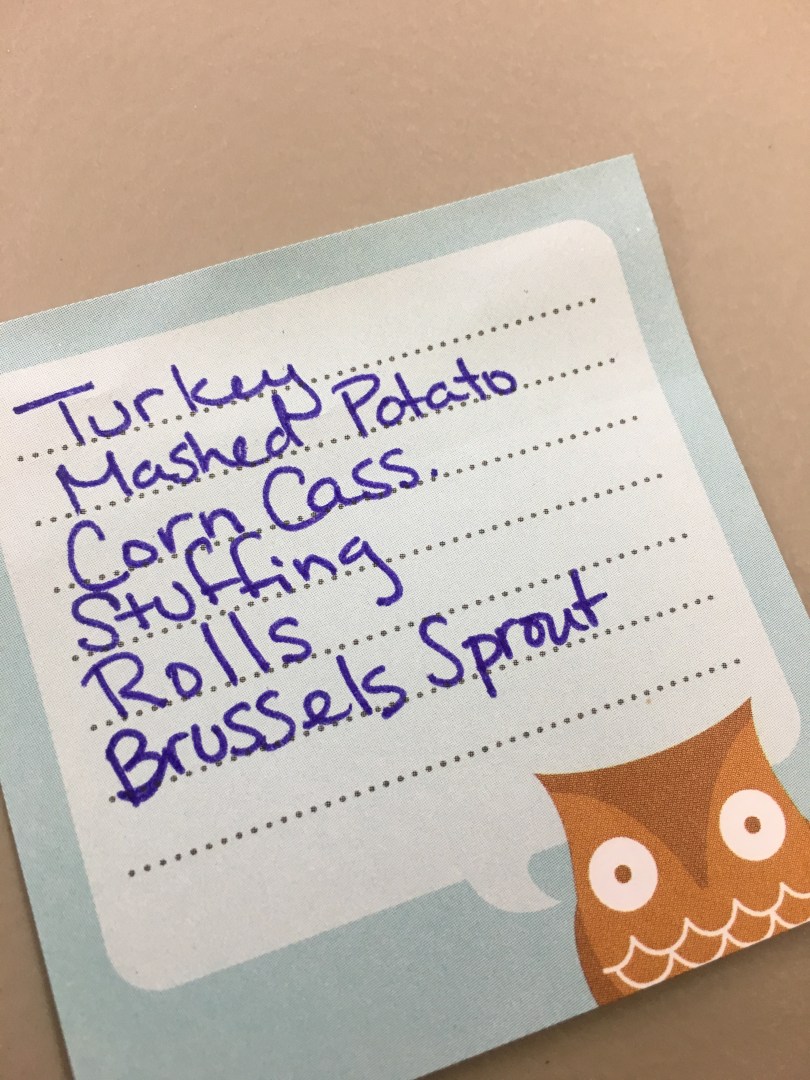 A big turkey from Trader Joe’s. Stuffing made from Walmart’s gluten-free white bread. Rolls made from teff flour. My kids favorite chocolate pie. The salad may change to Brussels sprout salad, but then I would need to change my roasted vegetable.