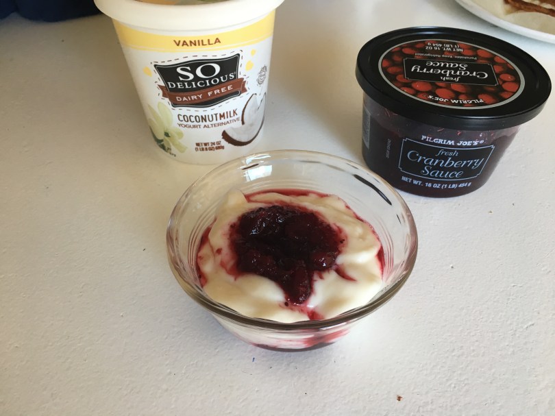 This year it was Cranberry parfaits. A two ingredient recipe, cranberry sauce and yogurt.