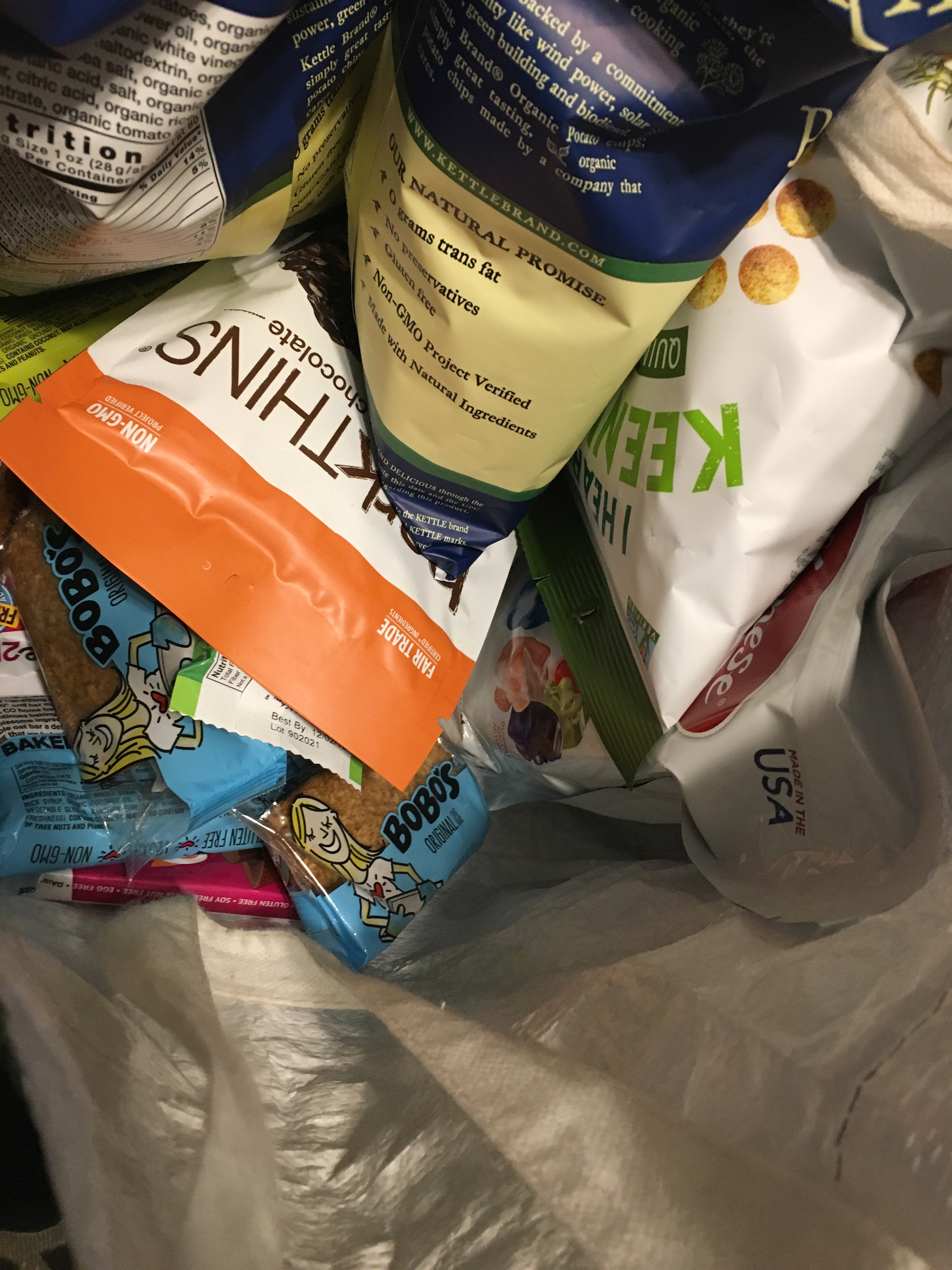 For this trip I bought my favorite BoBo’s Bars. I like the original and the Apple Pie flavors. I like to carry three in my carry-on for flights. I bought my nightshade eating child Kettle Chips, and for me Heart Keenwah “Herbs de Provence” . For treats I had Sunflower Butter Cups Free 2 B, and one mint cup, some Junior Mints, CoComels, and Pumpkin Seed barkTHINS.